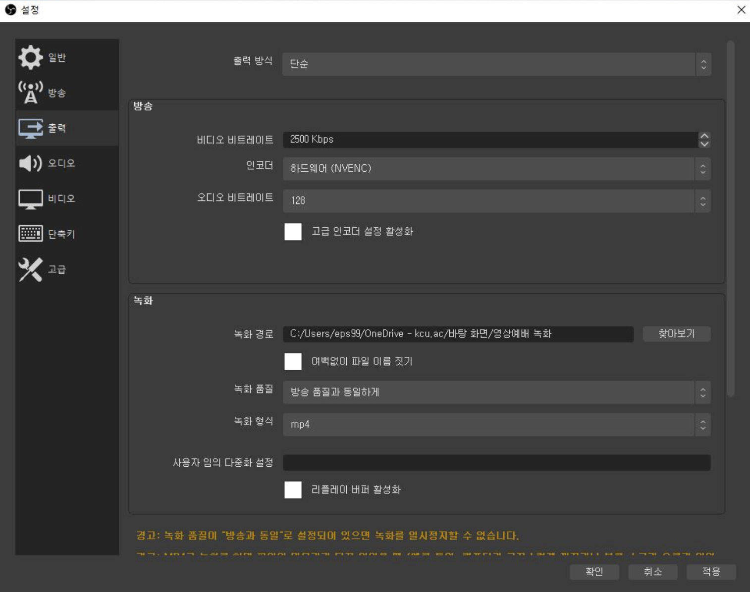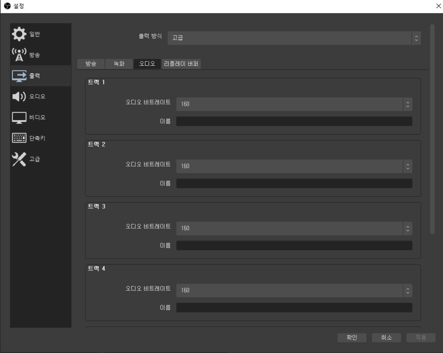 출력 탭을 처음 열면 "출력방식"이 "단순"으로 되어있습니다. 그것을 먼저 "고급"으로 변경해주세요. 변경해야 방송을 위한 세밀한 설정을 만질 수 있습니다.